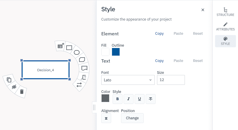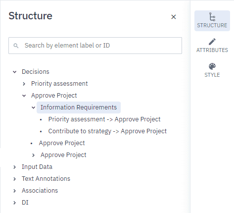 Navigate and customize your DMN model. The Structure tab lets you explore the decision structure, while the Attributes and Style tabs allow you to configure component properties and appearance.