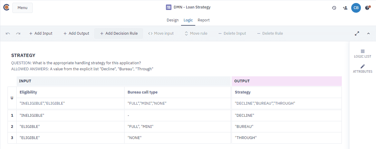 Decision tables are created in the Logic tab with a default input and output. You can add multiple inputs and outputs to the table.